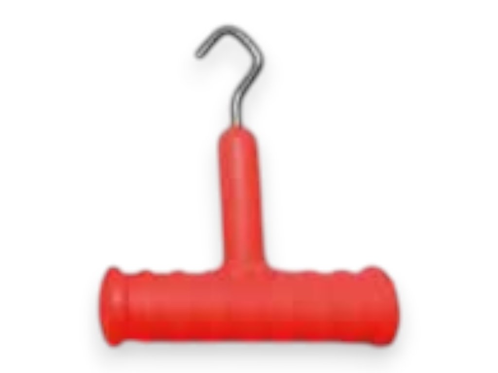 Praktický plastový vyprošťovač háčků s různými velikostmi na obou koncích a integrovanou jehlou pro rozvazování uzlíků.