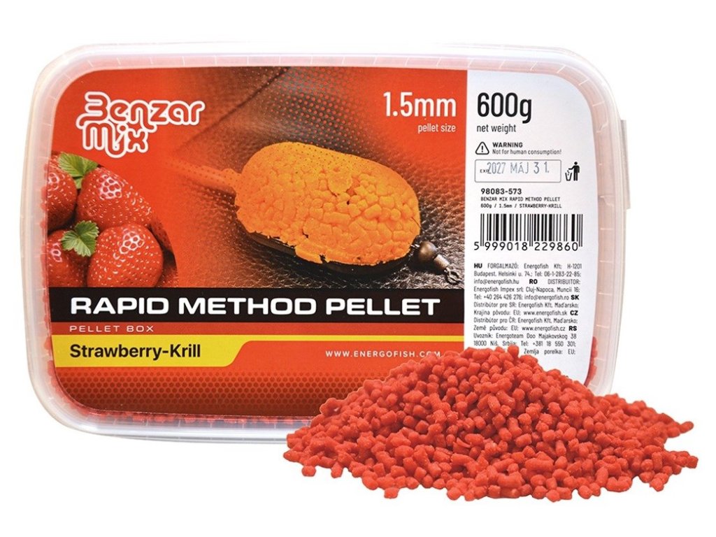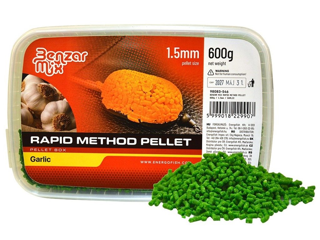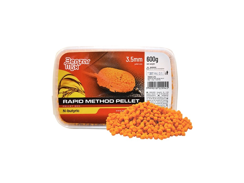 Benzar Mix pelety Rapid Method Pellet 600 g jsou ideální volbou pro rybáře, kteří hledají rychlou a efektivní návnadu pro method feeder lov. Pelety jsou připravené k okamžitému použití a nabízí širokou paletu příchutí, které přitahují kapry a další ryby.