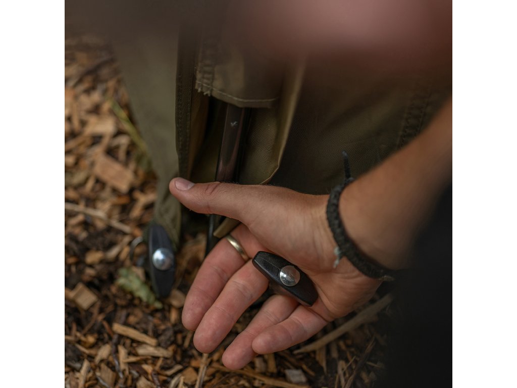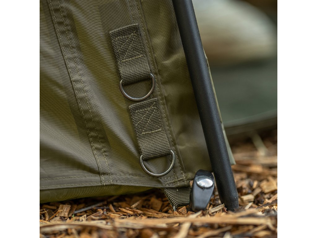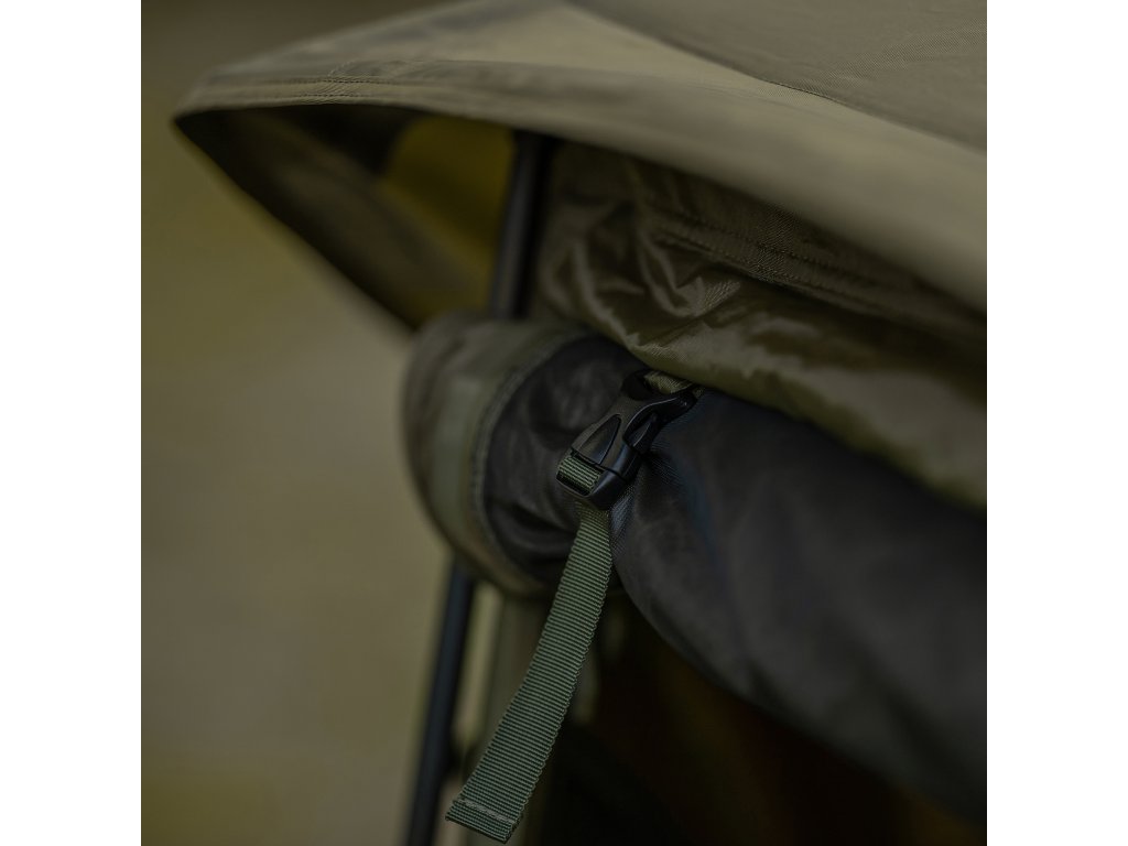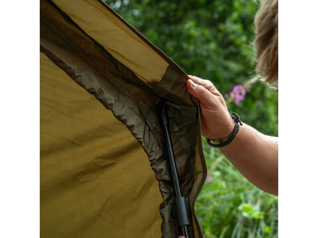 Pripínanie pomocou zipsu na zaistenie ochrany pred letným hmyzom a pre zachovanie chladného vánku počas úkrytu v bivaku Hide Camo Pro.