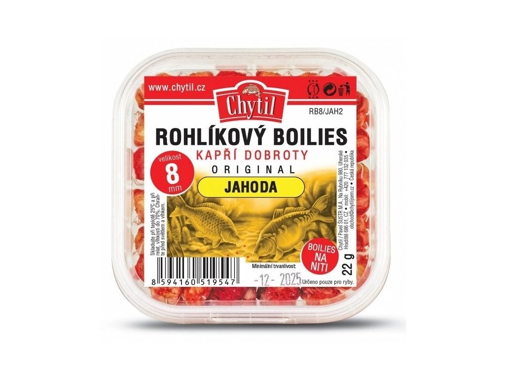 Rohlíkové boilies Chytil s priemerom 8 mm je menšia, ale rovnako účinná verzia obľúbenej klasiky. Vďaka jemnejšiemu priemeru sa skvele hodí na feederový rybolov či lov menších druhov rýb. Dodávané v praktickom kelímku, pripravené na okamžité použitie bez ďalších úprav.