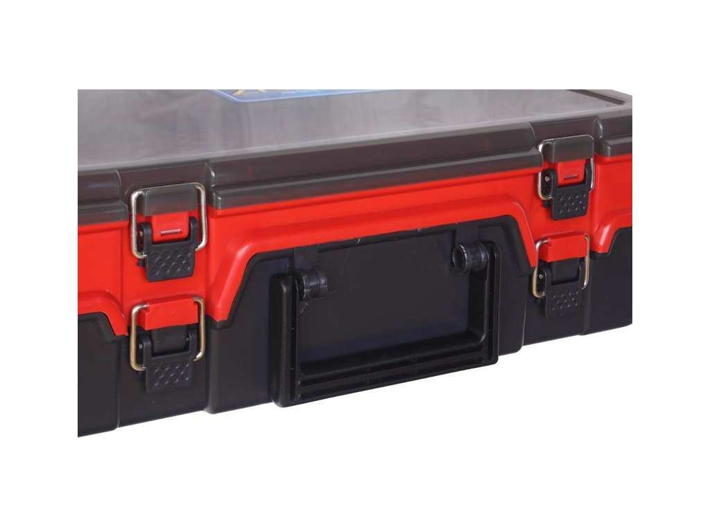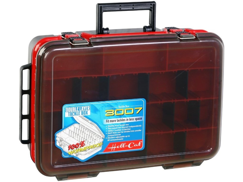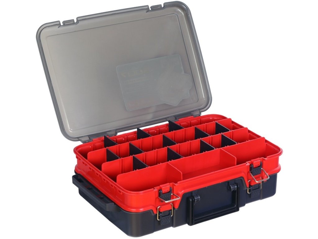 Praktický kufrík, ktorý obsahuje dve samostatne uzatvárateľné poschodia, ktoré uzamykajú kovovými prackami. Každé poschodie má nastaviteľné priehradky, spodné 9 väčších a vrchné 18 menších. Na bokoch sú dva manipulačné úchyty, a vo vrchnej časti je hlavné madlo slúžiace na prenášanie kufríka. Kufrík je vyrobený z kvalitného plastu a je vodeodolný, čo ochráni rybárske doplnky pred nežiaducou koróziou.